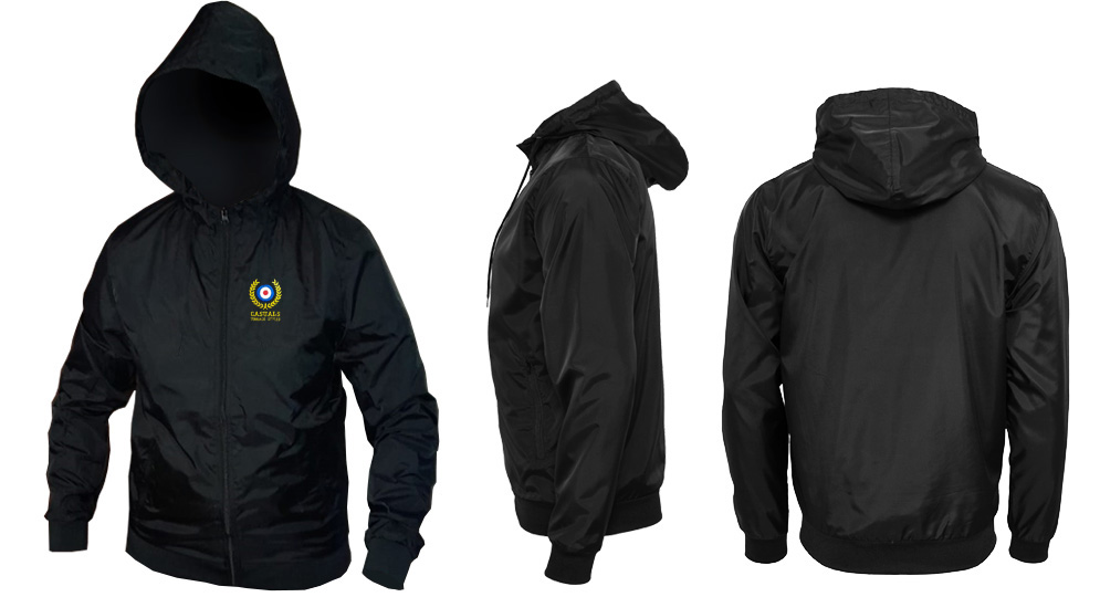100% Polyester - waterproof - knit cuffs and bottom - full zip - two zip pockets - inner lining of the hood - medium weight